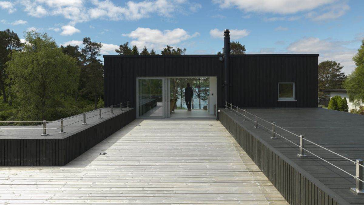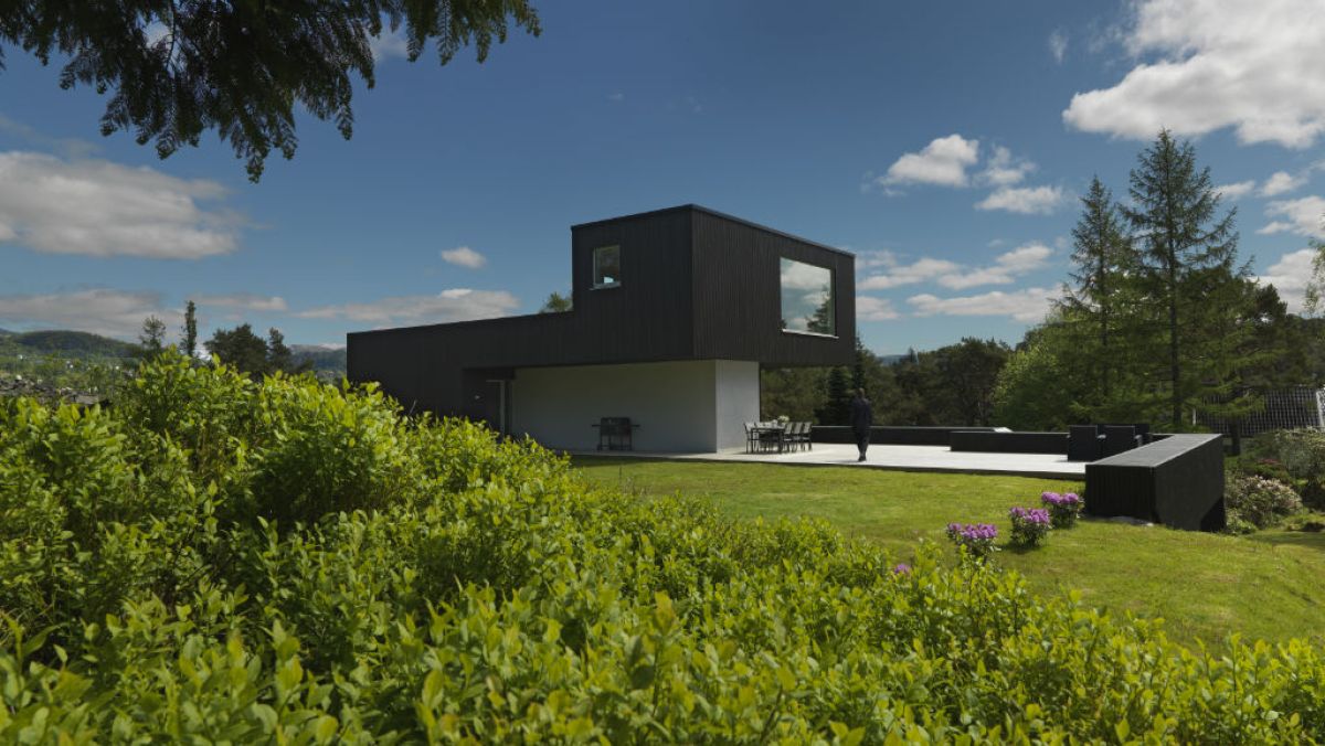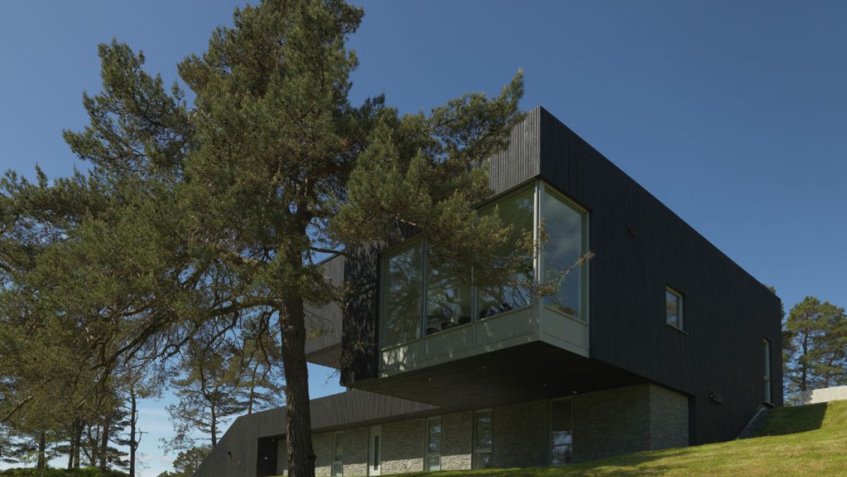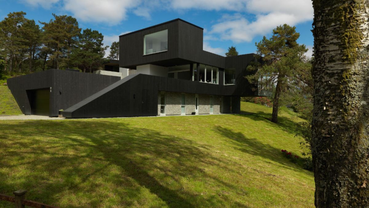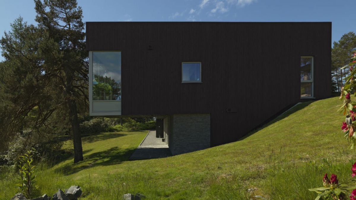 Bolig fra Saunders Architecture. Nydelig designet hus over 3 plan med store terrasser og utearealer. Bærekonstruksjoner i tre, stål og betong. Eksteriør hovedsakelig av tre, men med innslag av puss og stein.